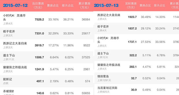 2015暑期档,《小时代4》与《栀子花开》狭路相逢,多数人都乐见这两部片厮杀的惨状,并没有太多注意力被分配在一部没有任何明星阵容的动画影片《大圣归来》之上。上映之前,《大圣归来》的预排片低至5%以下(甚至有人预期是1%)。10号当天撞上《小时代4》,几乎没有人注意到这部《大圣归来》,排片仅为7.16%,当天报收票房2900万;随着口碑与票房的发酵,《大圣归来》的排片正在悄悄地提升。7月12日《大圣归来》的排片已上升至11%,3天累计票房近9500万;截至13日中午,票房已过亿。